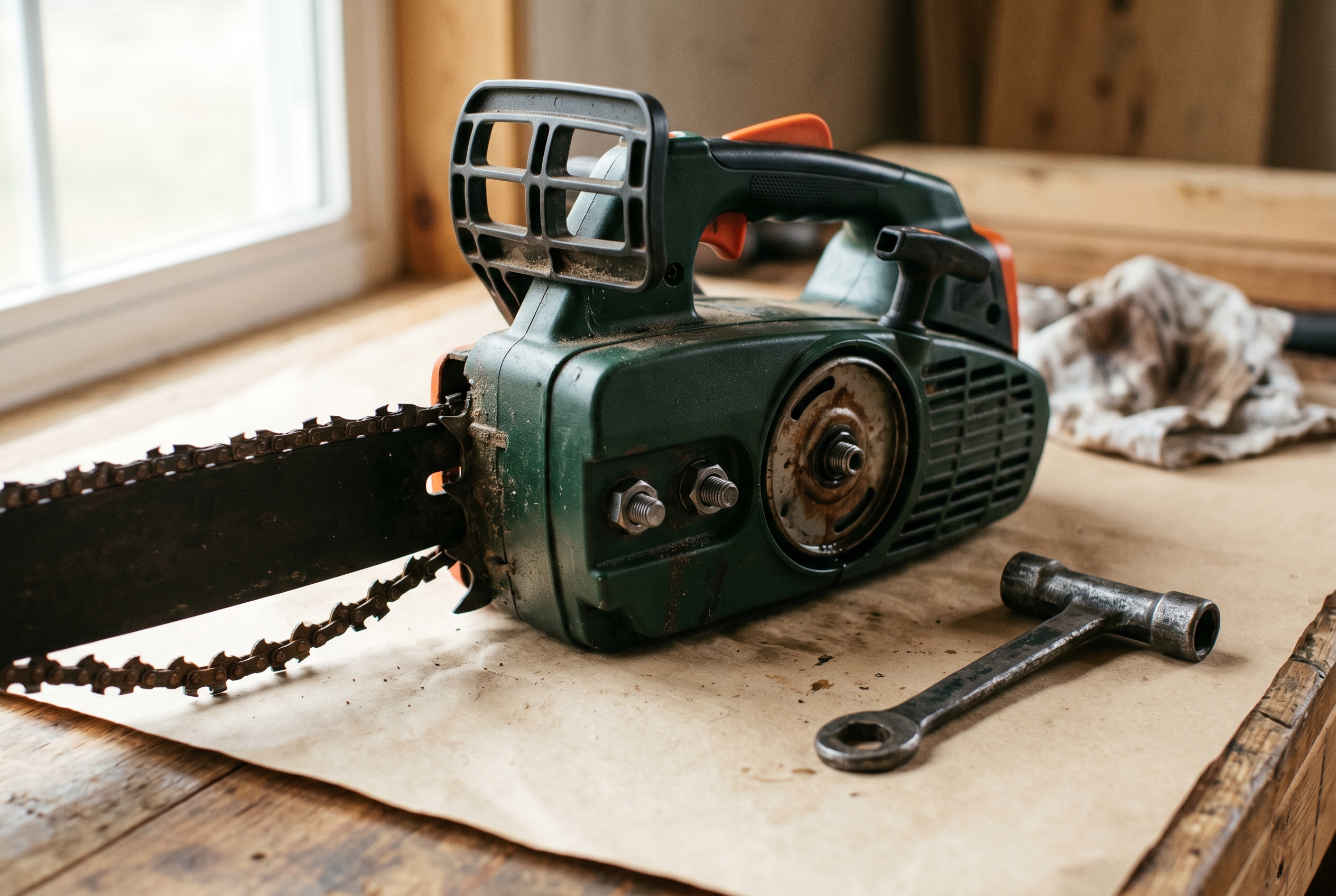 Two things to have on the bench before you begin: a scrench and a rag. Bar oil will drip when you pull the cover.
