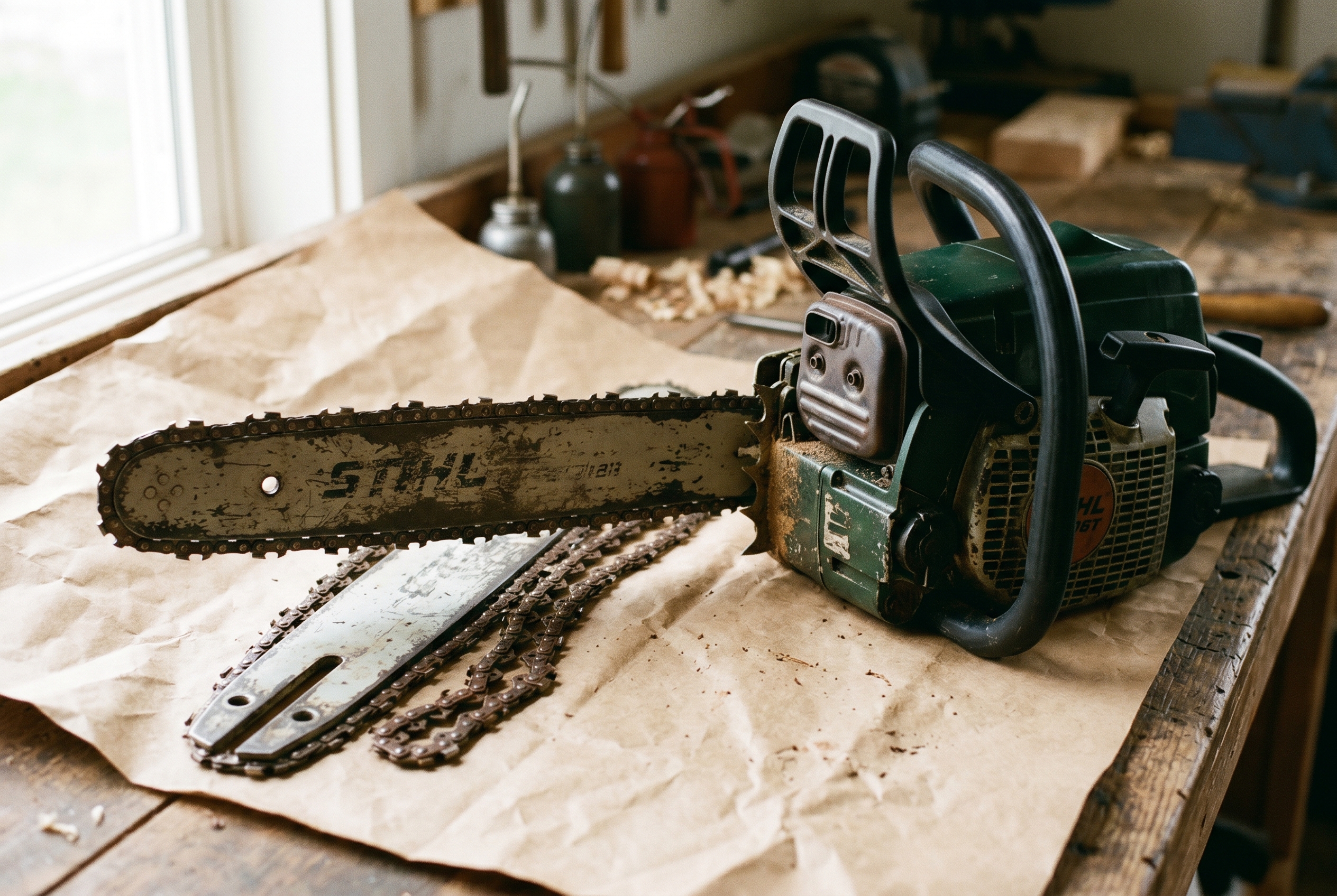 Confirm you bought the right bar and chain. Three numbers on the old bar, length, pitch, and gauge, must match the new bar. The chain's drive-link count has to match the new bar's length, and its pitch and gauge must match the chain you are buying.