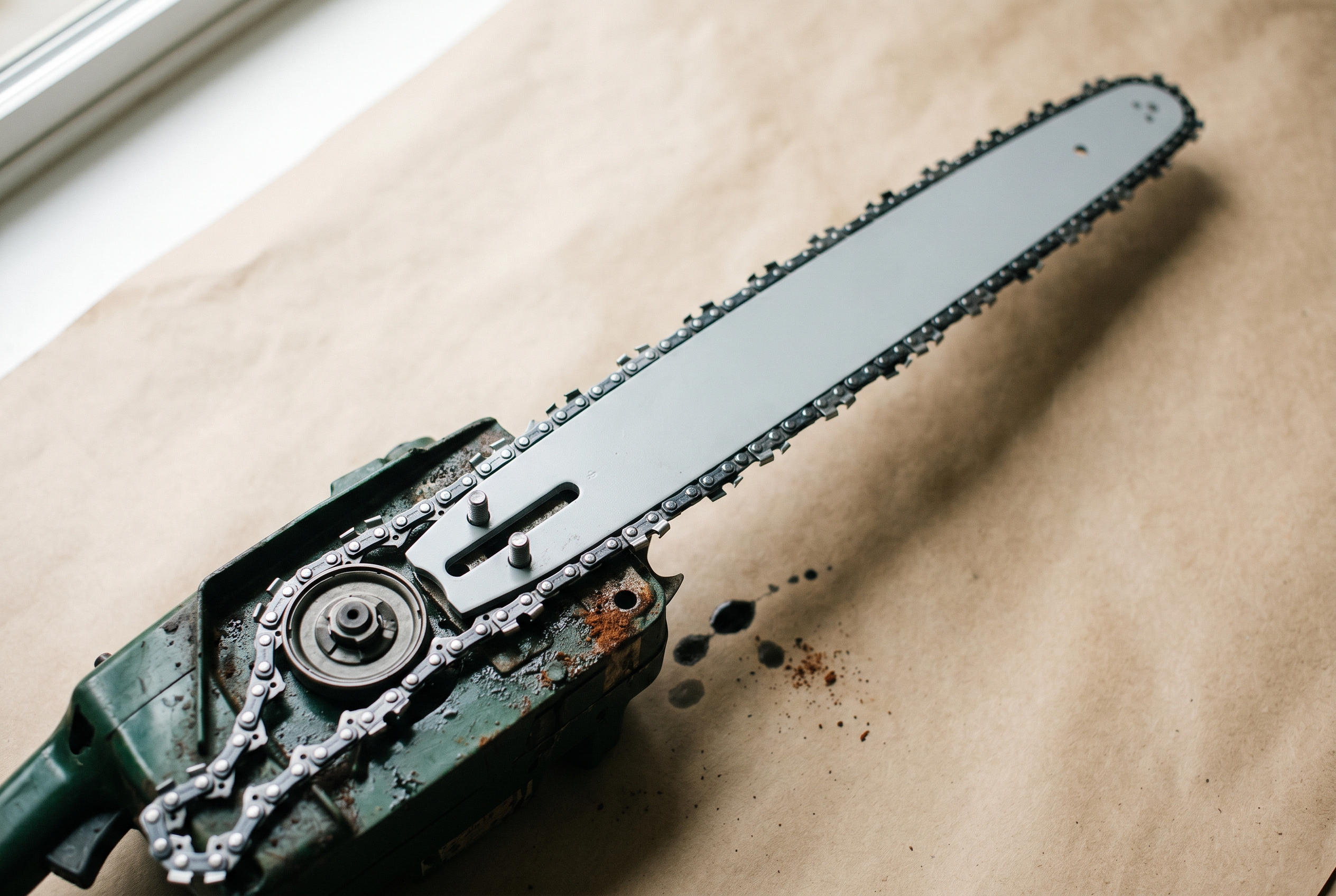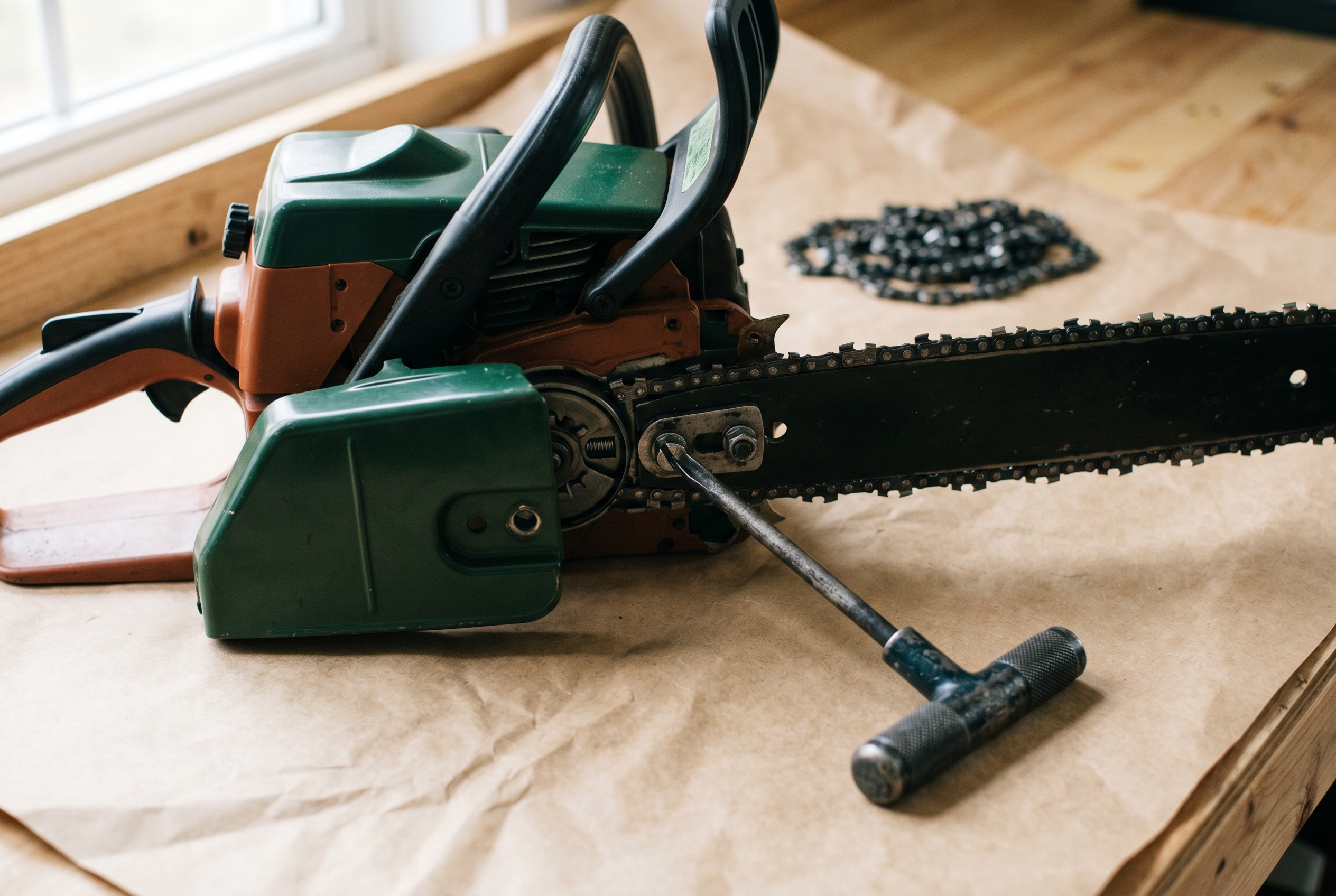 The correct tension is simple: with the saw flat, lift the drive link in the middle of the top of the bar. It should lift until the drive-link tips just clear the bar groove, and fall back fully when released. If you can lift it entirely clear of the groove, it is too loose. If it will not lift at all, it is too tight.