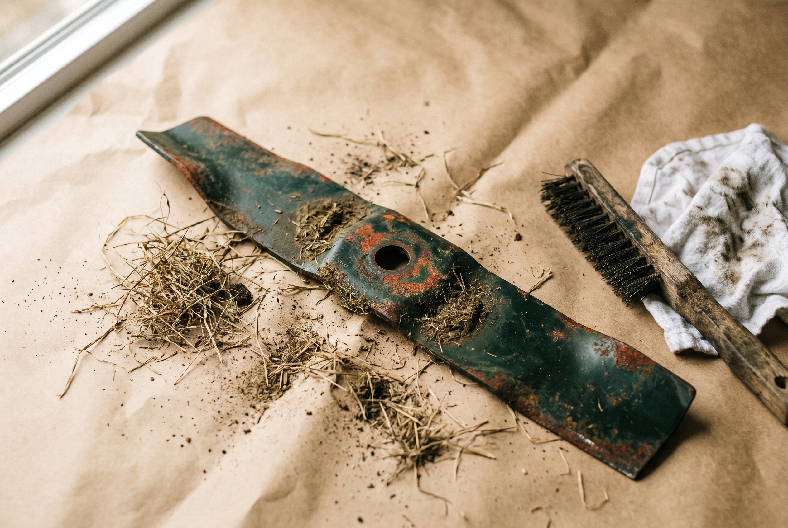 Lay the blade on the bench and wire-brush both sides until the dried grass, dirt, and oxidized oil are gone. Wipe with the rag and inspect the edge under a light.