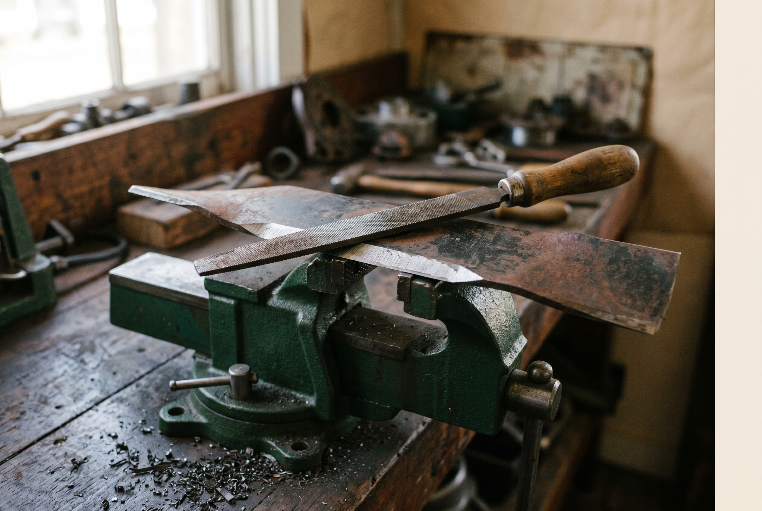 - A bench vise mounted solidly to a workbench