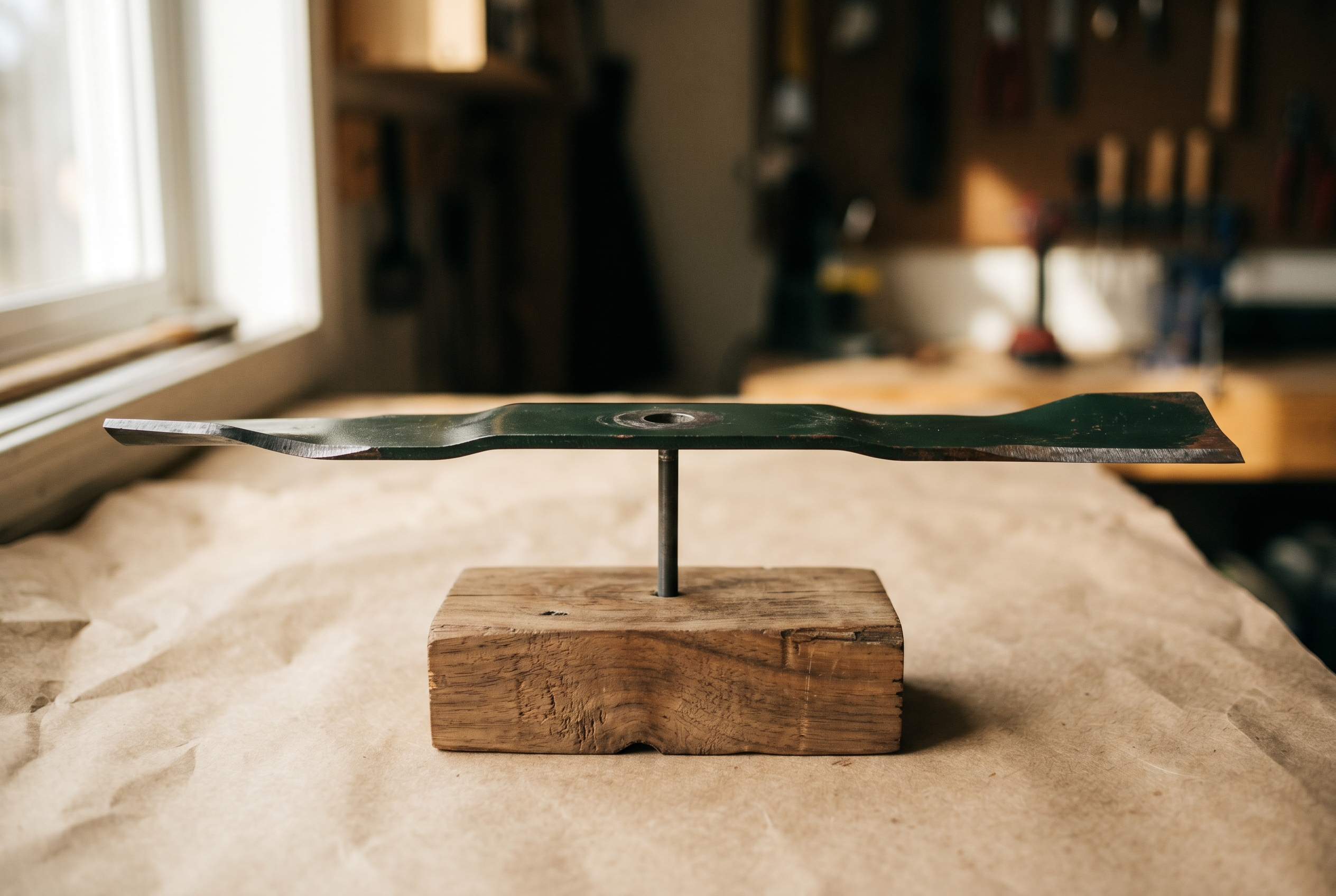 A sharpened blade must be balanced. Set its center hole over a horizontal balance pin. A balanced blade sits level. If one side drops, that side is heavier. File one or two more strokes from the bevel on the heavy side and re-check.