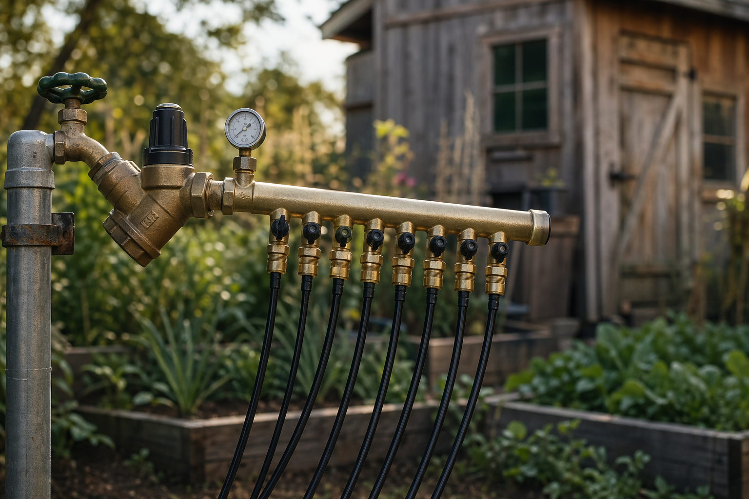 I coordinate a community garden in southeast Portland: sixteen 4×8 cedar beds on one side of the shed, sixteen on the other, plus two rows of perennials along the back fence. Until this year we irrigated by timer-on-hose-bib-plus-four-way-splitter, which is what most of us started with and what most of us eventually outgrow. When too many members asked me "why does bed 14 always look bone-dry?" I started looking at manifolds seriously.