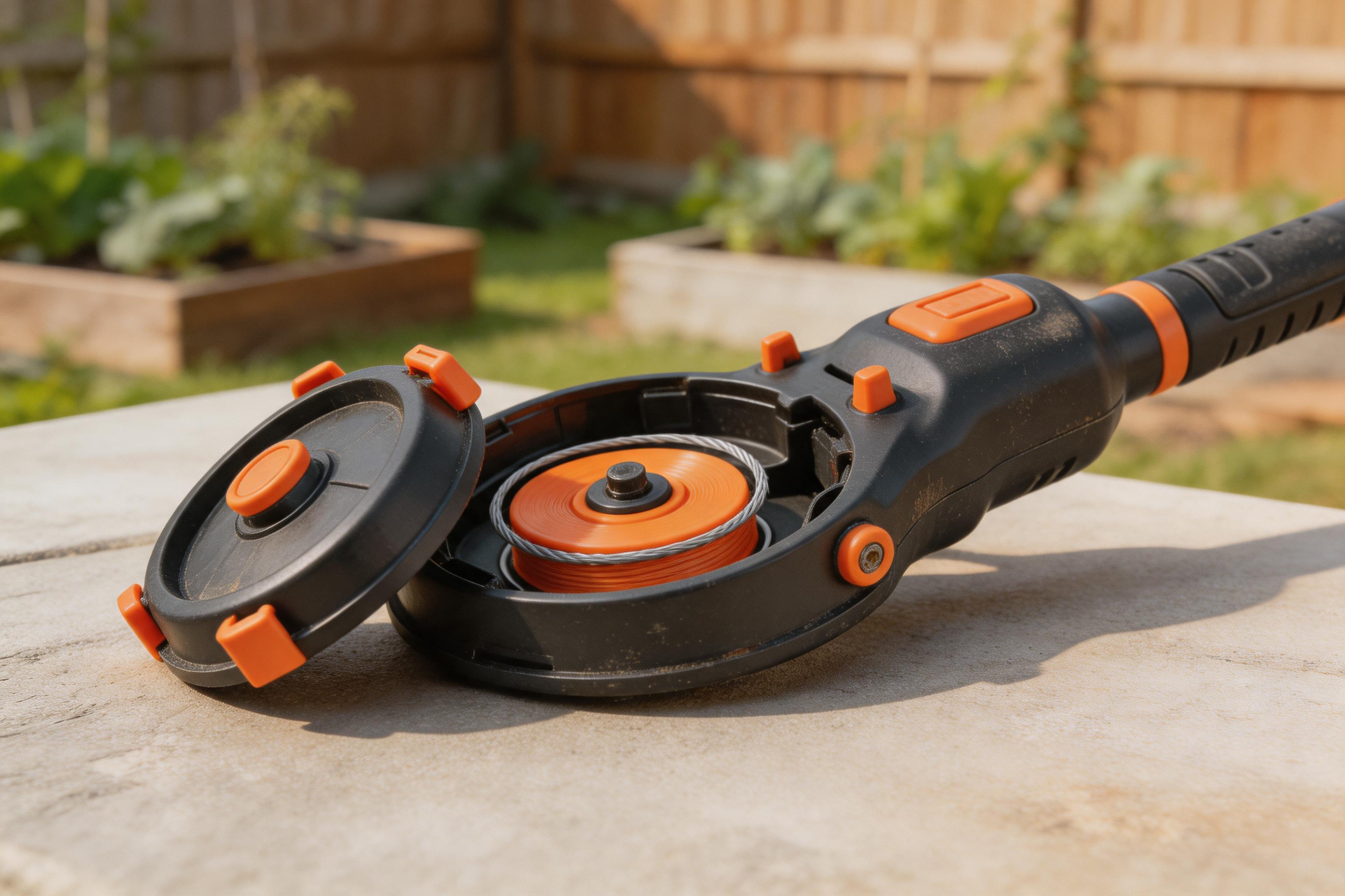 Remove the battery and set the trimmer on a patio table or bench where the head is easy to reach. Brush packed grass away from the cap tabs before you squeeze them. Many broken caps start with forcing the latch over dried clippings.