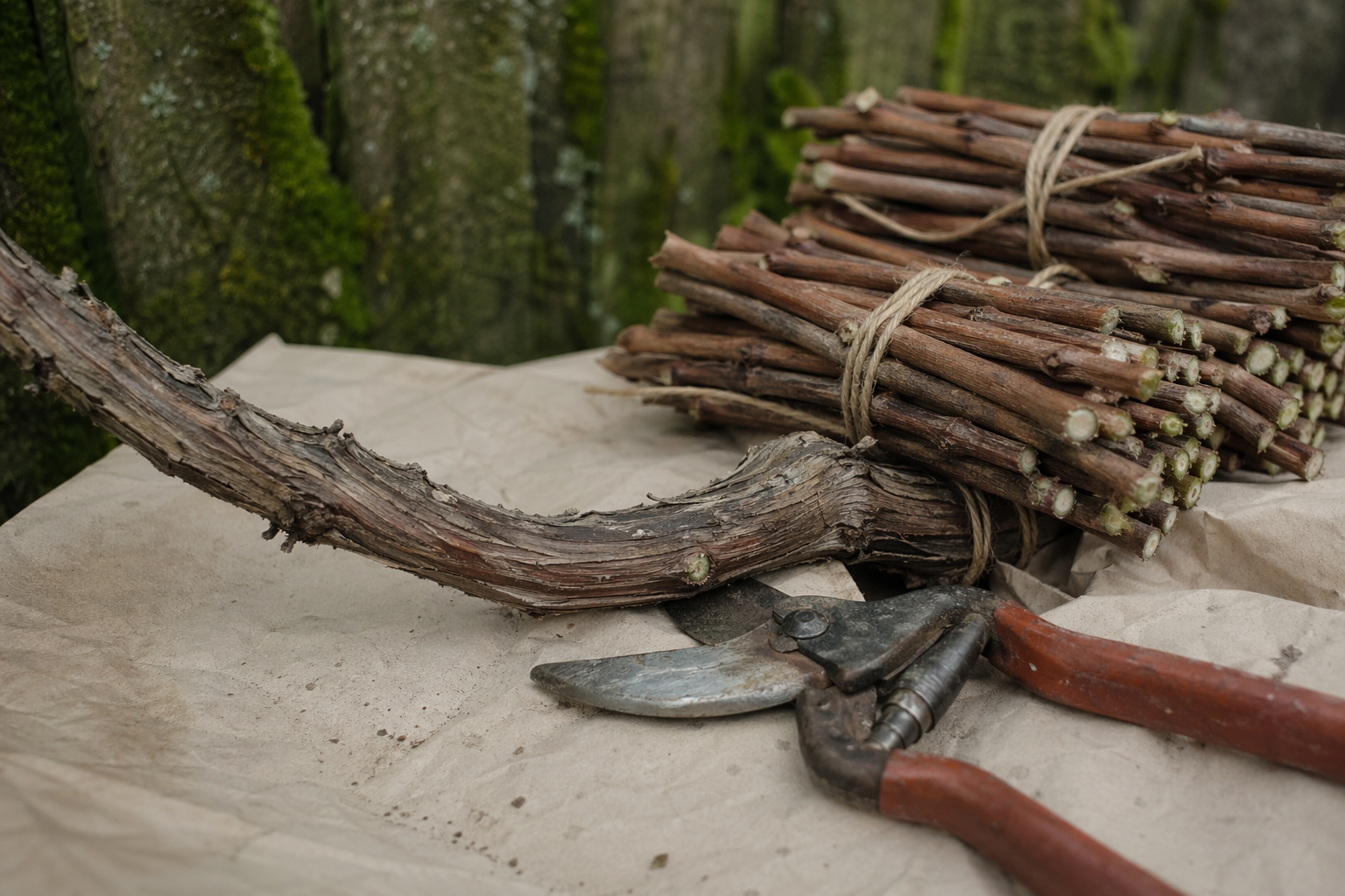Bypass pruners and a pair of 30-inch loppers. Wisteria, grapevines, hydrangea paniculata, fruiting raspberries, summer-flowering clematis. Cut before sap rises; the wounds heal cleaner. Skip spring-flowering shrubs — rhododendron, lilac, mountain laurel — those you prune after they bloom.