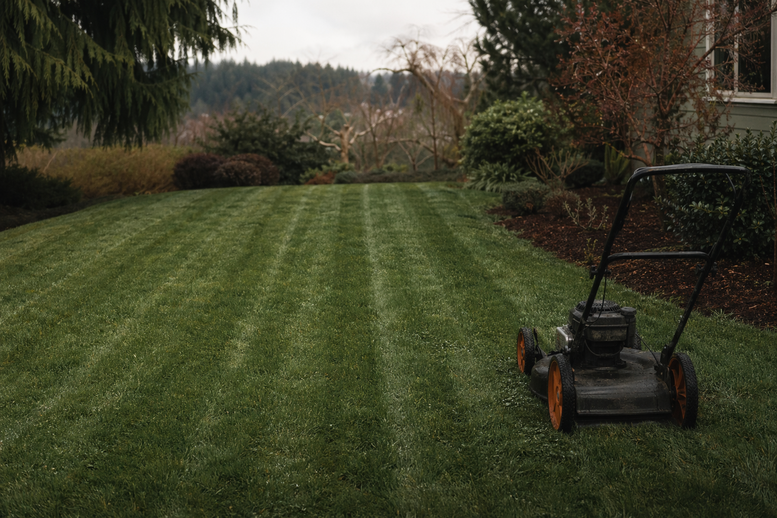 The first mow is tall. Set your blade at 3.5 to 4 inches and just top the existing growth. A low first cut shocks the grass, invites moss, and exposes soil to the early-season slugs.